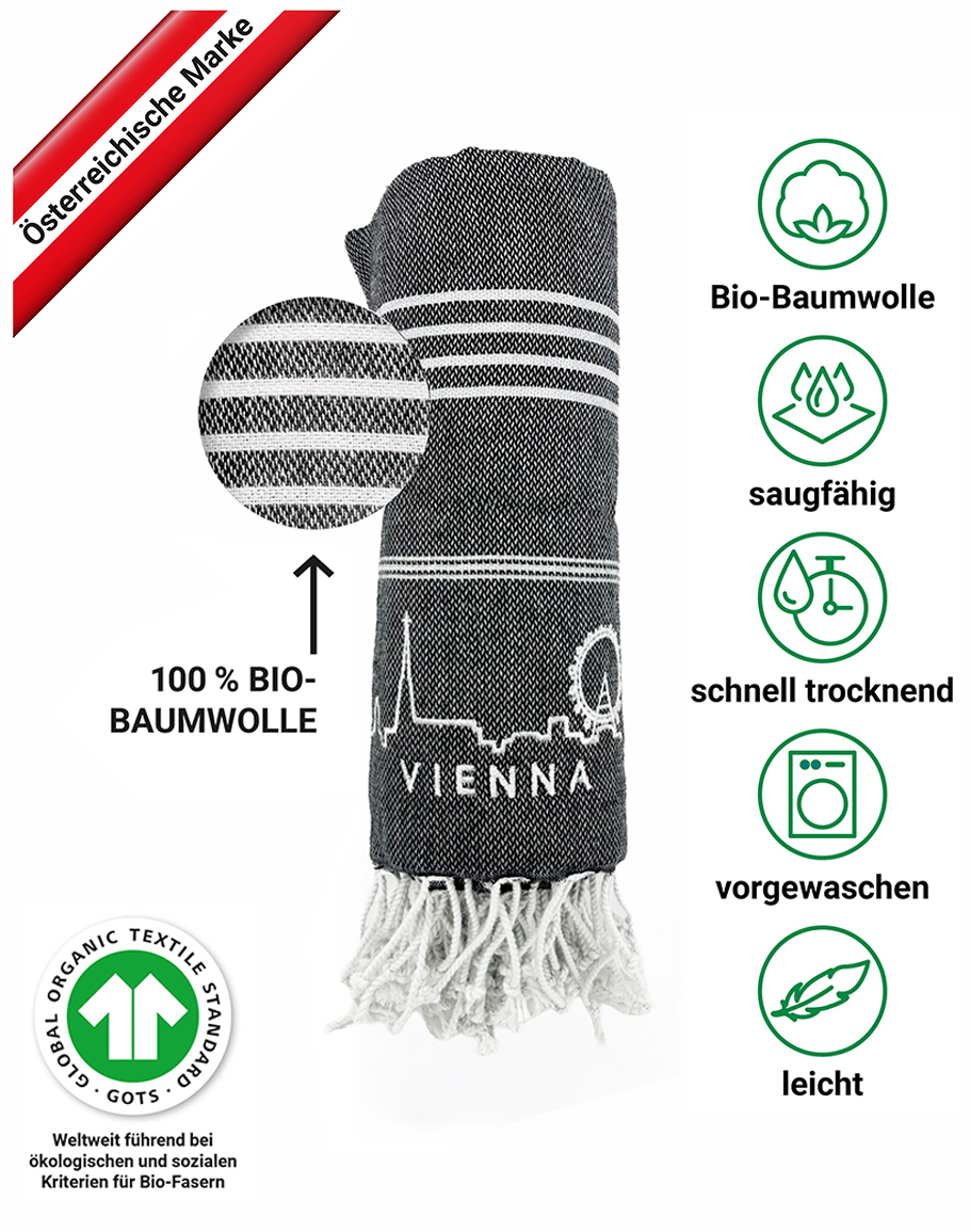 Leichtes Hamamtuch aus 100% Bio-Baumwolle – saugstark, schnelltrocknend und platzsparend. Mit gestickter Wiener Skyline. Ideal für Strand, Sauna und Reisen.