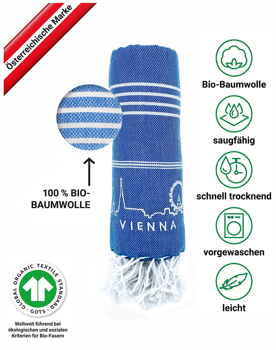 Aus 100% Bio-Baumwolle – vorgewaschen, saugstark, schnelltrocknend und platzsparend. Veredelt mit einer gestickten Wiener Skyline wird dieses Hamamtuch zum besonderen Begleiter für Reisen, am Strand, in der Sauna, beim Sport oder im Alltag.
